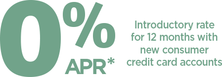 0% INTRODUCTORY ANNUAL PERCENTAGE RATE (APR)*Apply Now FOR 12 MONTHS WITH NEW CONSUMER CREDIT CARD ACCOUNTS *Effective 1/9/25: 0% introductory APR for the first 12 months on purchases, balance transfers and…